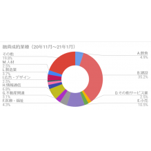 1回目の緊急事態宣言もあり、 飲食・理美容・その他サービス業等、 接客を要するサービス業関連が4分の1を占めていた。 建設業も、 この段階で4分の1弱と高い割合を示してはいるものの、 コロナを機に急増した状況ではなく、 後述の2020年後半に比べると特徴的とは言えない状況であった。
