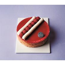 クリームチーズのベイクドチーズケーキとマスカルポーネのレアチーズケーキの2層仕立て。 ラズベリーソースと野いちごをあしらい、 マスカルポーネの生クリームでデコレーション。