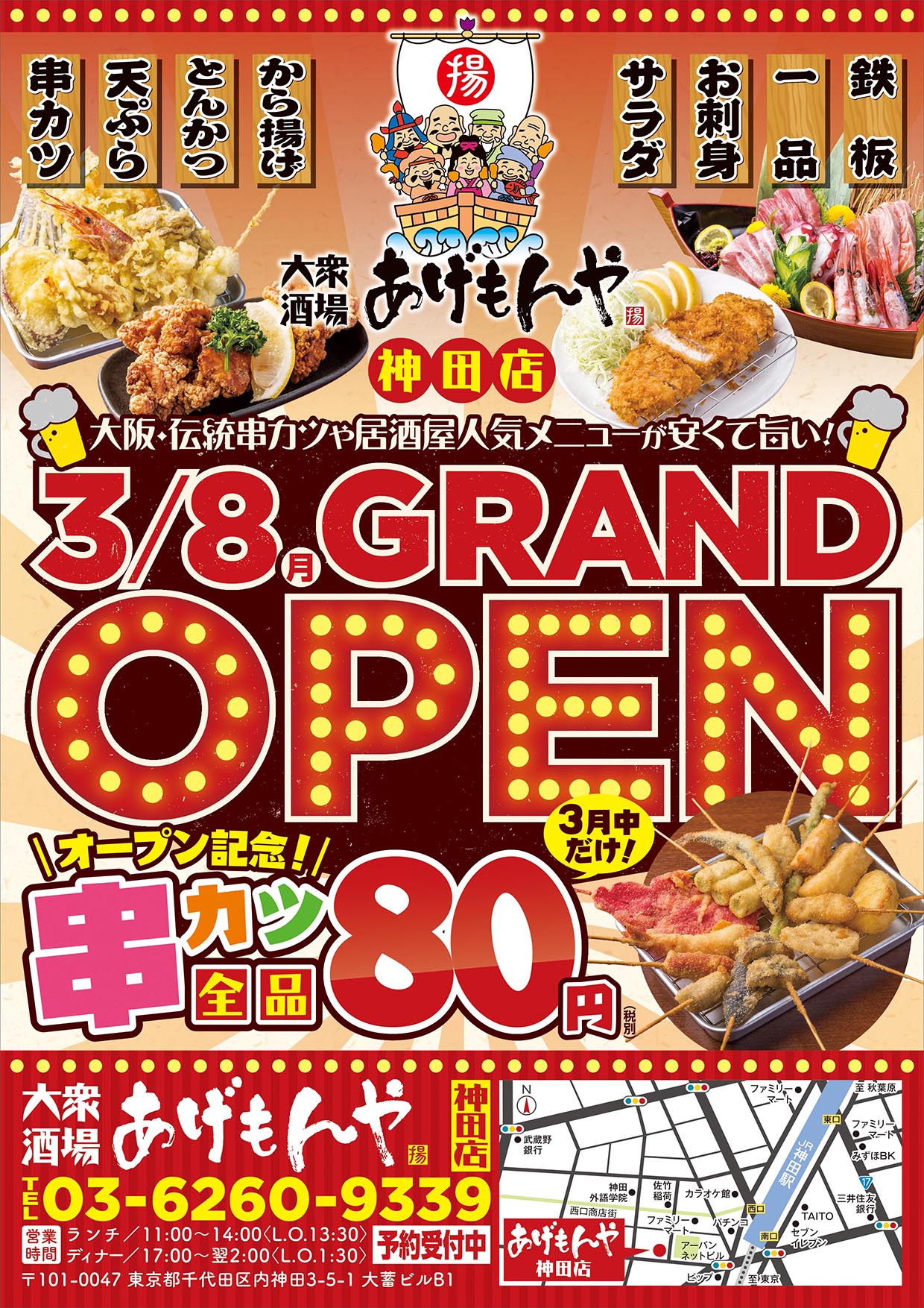ご家族3世代が楽しめる居酒屋として人気の「大衆酒場あげもんや」が、 3/8(月)神田駅前にオープン致します。