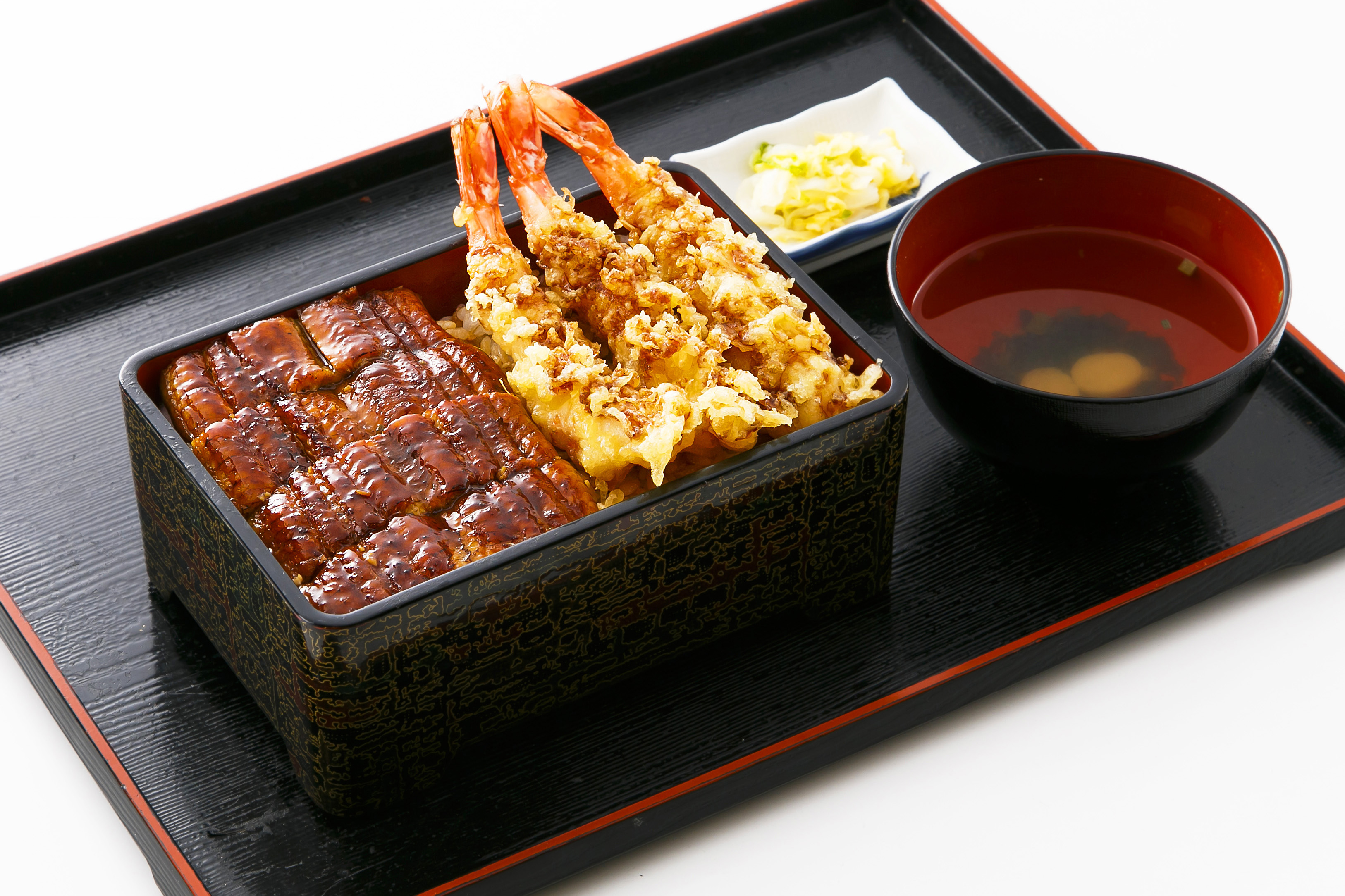 うなぎと海老天ぷらが両方楽しめる一品♪ 【うなぎ海老天重】1380円(税抜価格) ※テイクアウト可