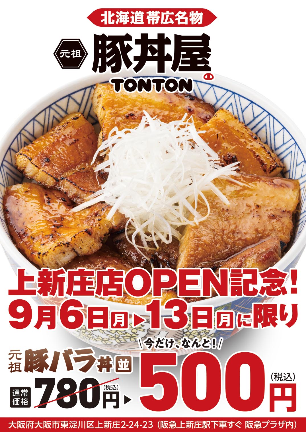 上新庄店のオープンを記念して、9/6(月)~13(月)に限り、当店自慢の「豚バラ丼〈並〉」を特別価格500円にて提供いたします。